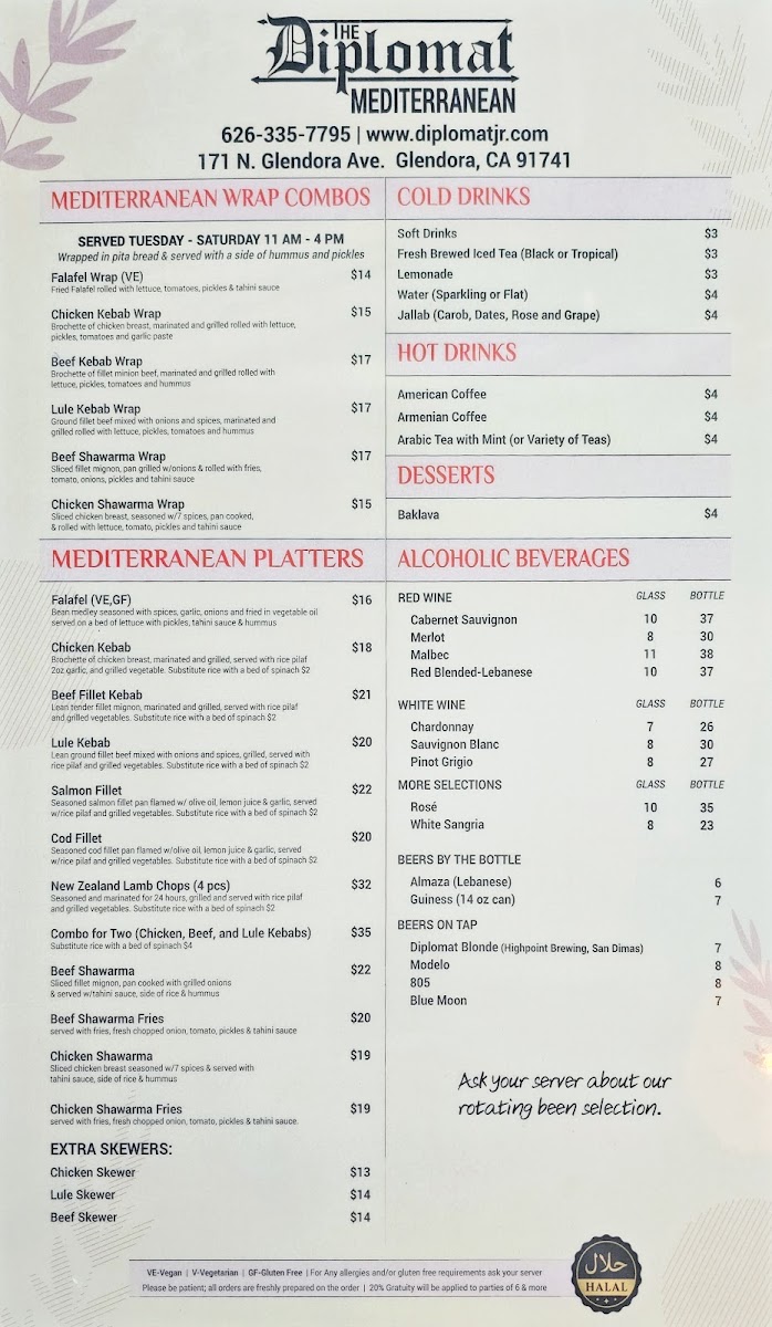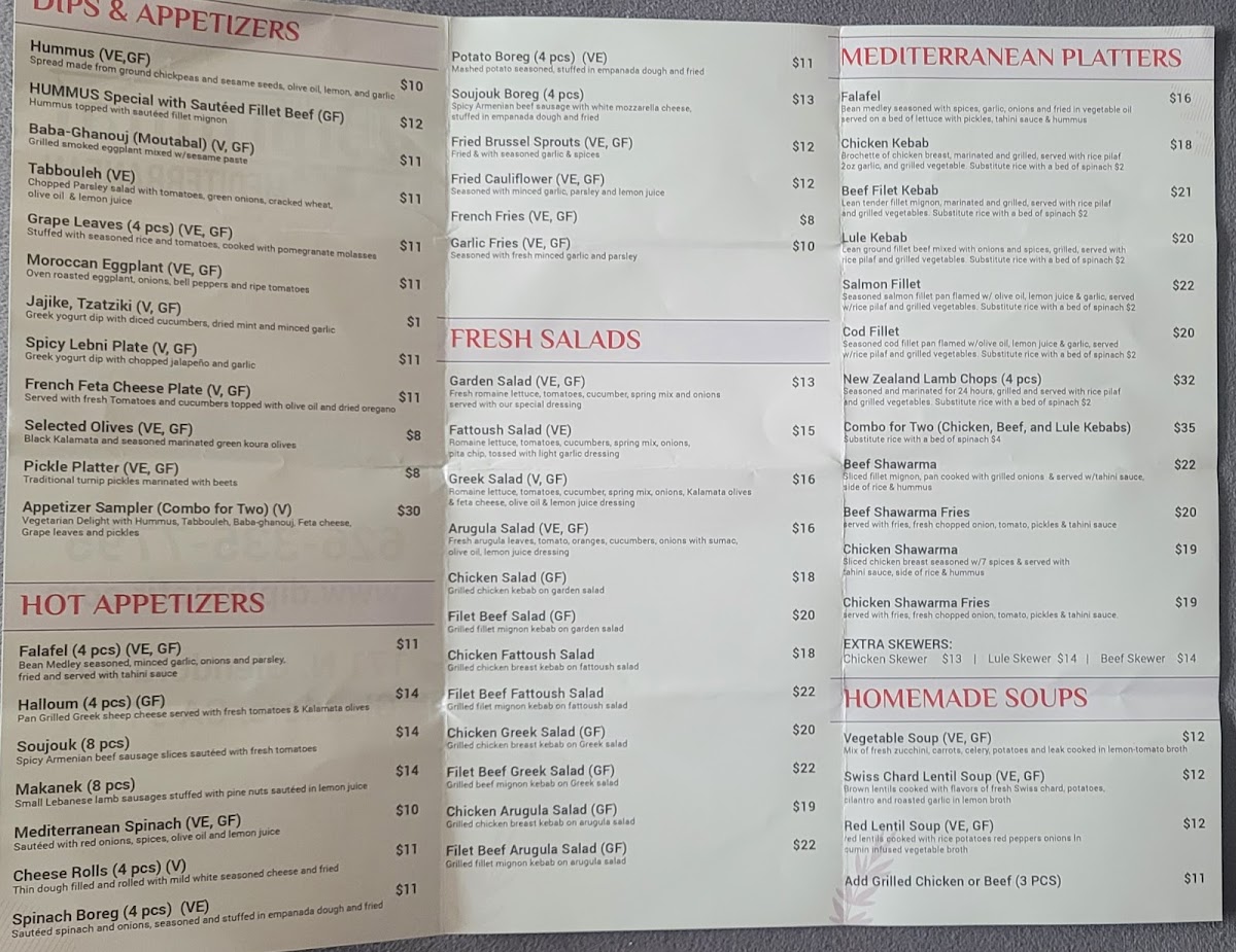 Overall, the menu supports a casual, welcoming setting where guests can enjoy the simplicity of well-crafted Mediterranean dishes and thoughtfully prepared beverages in a friendly and unpretentious environment.
